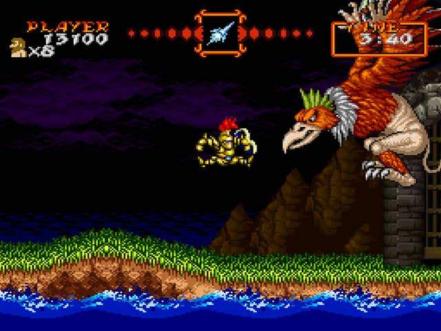 But Arthur's slightly improved mobility (double-jump or not, the boy moves like a tank) and wide weapon arsenal doesn't erase an important fact about Super Ghouls 'n Ghosts: Victory is only possible if you memorize every pixel of every level. You need to know enemy patterns inside-out. You need to know where power-ups will spawn, and which weapon is suited for which bad guy. You need to know where platforms will give out on you, and where the actual stage background will rise up to kill you.